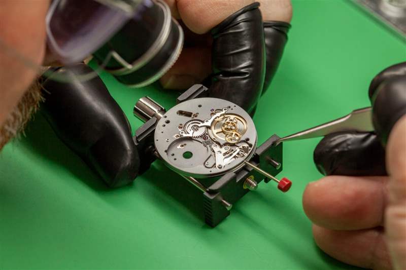 Fears Garrick 發(fā)揮了他們的優(yōu)勢。UTG04 手動上鏈機芯是 Garrick 自己的,除了橋板上的現(xiàn)代無煙煤色飾面外,其超大的自由彈簧擺輪定義了它,通過表盤上的開口可見。如果您以前看過他們的任何 S 型號,您就會大致知道會發(fā)生什么。
