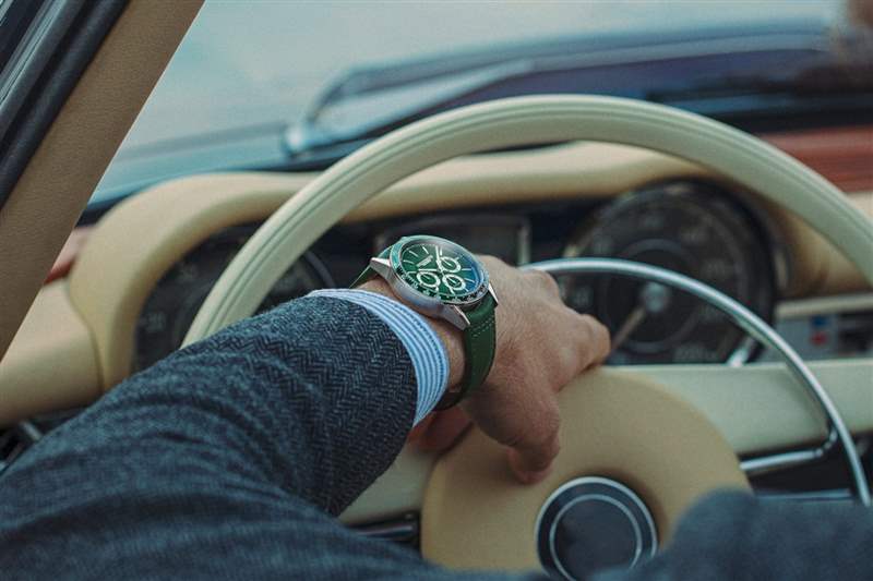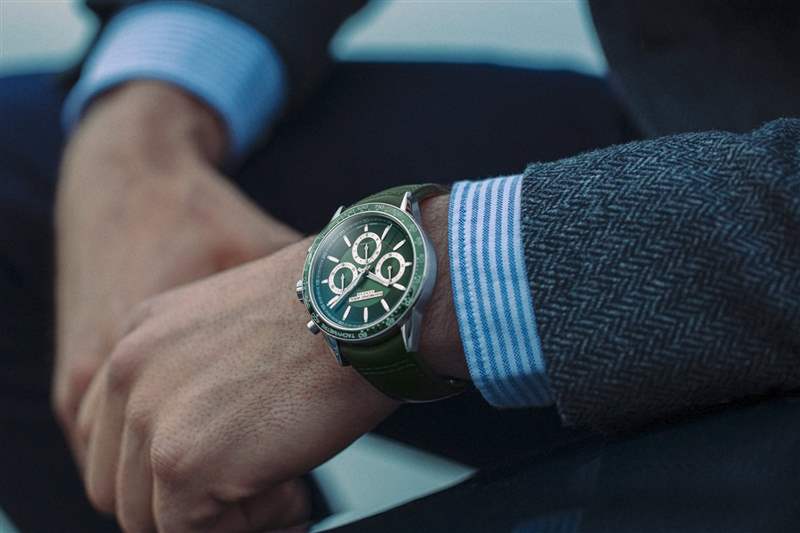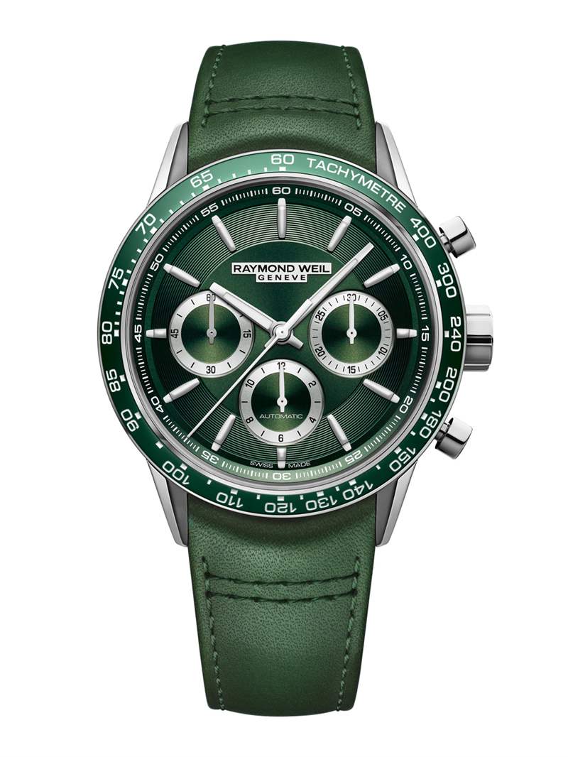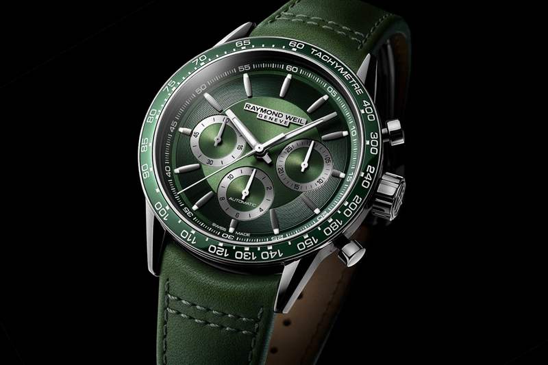 當(dāng)然,Green 并不是開創(chuàng)性的,如今每個制表師都有幾件帶有青翠表盤的作品,但 Raymond Weil 在這里真正擊中了時代精神。Freelancer Chronograph 7741 帶有外圍凹槽的略帶煙熏綠色的表盤與銀色環(huán)形 tri-compax 計時碼表之間的對比非??蓯郏沾设偳侗砣t略顯純色,適合讀取測速儀。