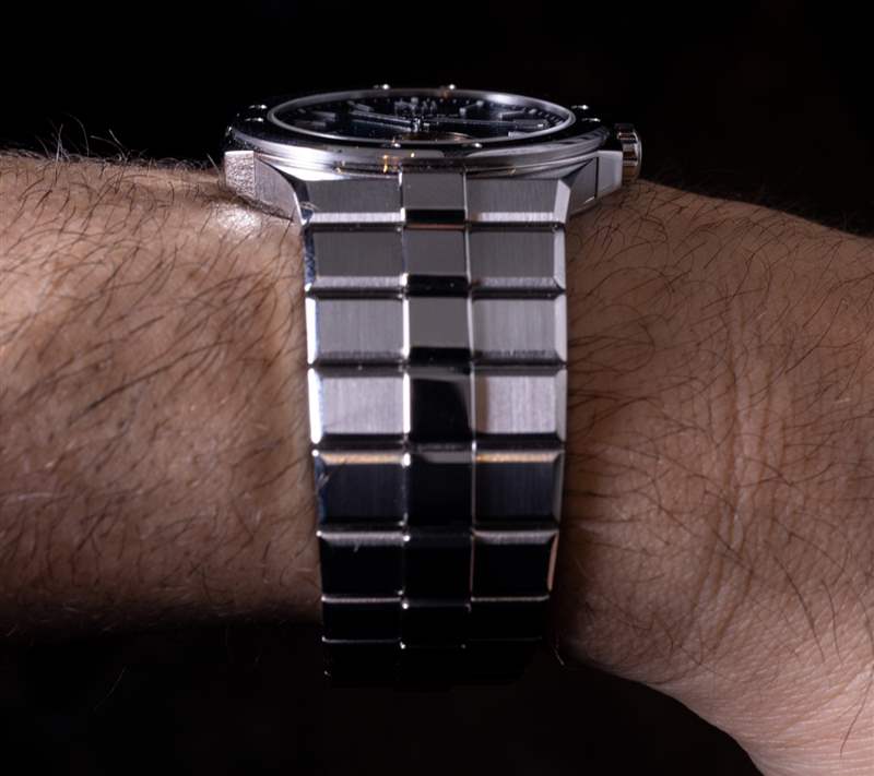 該表殼的尺寸略小,采用一種特殊的金屬合金制成,41 毫米寬,8 毫米厚,??蕭邦稱之為朗訊鋼。它的拋光效果與更標(biāo)準(zhǔn)的 316L 鋼略有不同,而且色調(diào)看起來更白一些。我同意朗訊鋼是一種很好的表殼材料。8 毫米的厚度可能足以讓蕭邦聲稱這是一款“超薄”時(shí)計(jì),但該公司通常不會(huì)在其名稱中使用如此自夸的形容詞,我傾向于欣賞這一點(diǎn)。Alpine Eagle 表殼的側(cè)面賦予其非常時(shí)尚的外觀,一體式表鏈制作精良,具有獨(dú)特的個(gè)性,很容易將其標(biāo)記為蕭邦產(chǎn)品(相對(duì)于競(jìng)爭(zhēng)對(duì)手的產(chǎn)品)。更重要的是,表殼防水深度達(dá) 100 米。