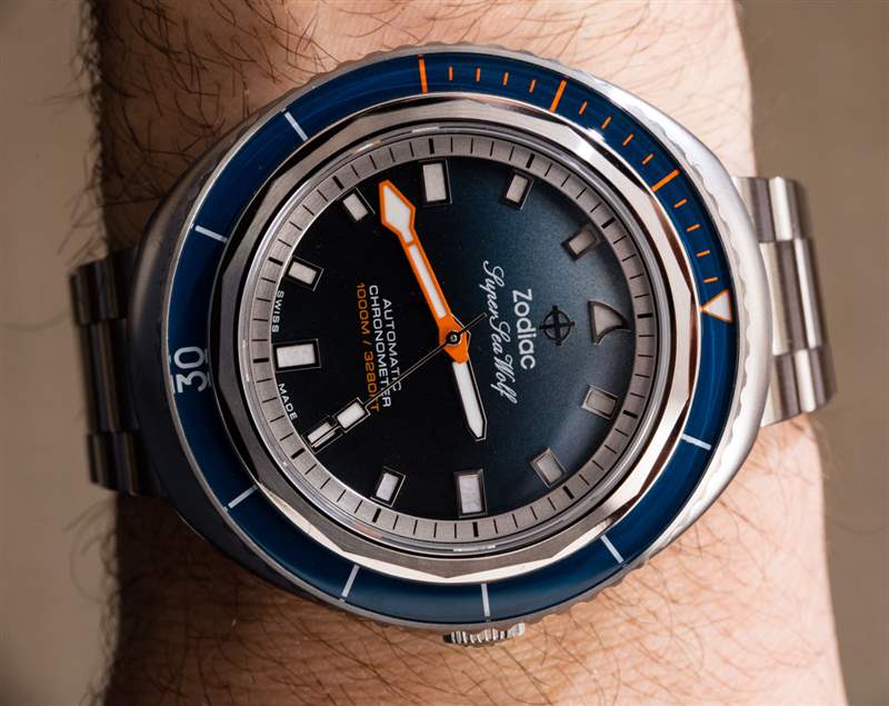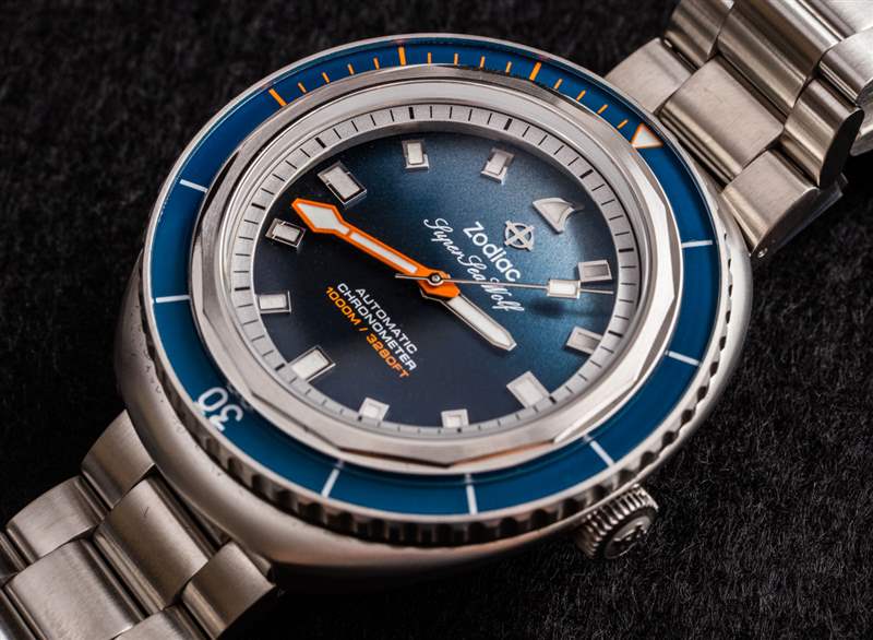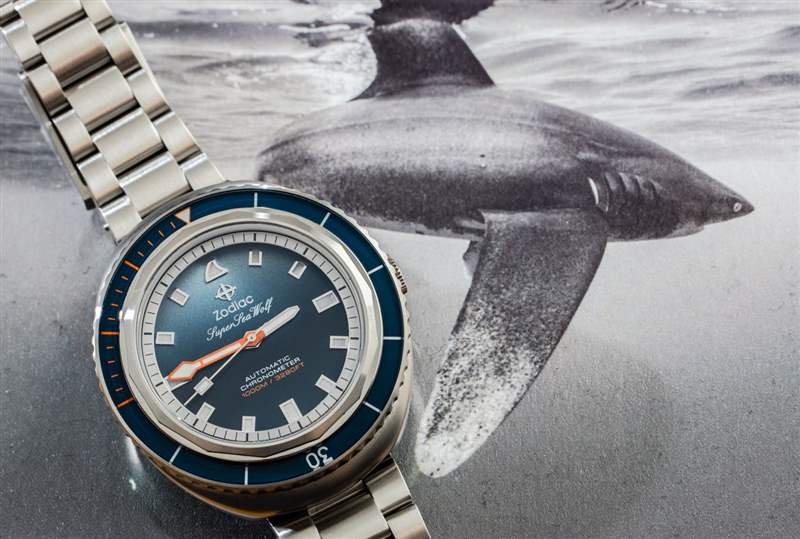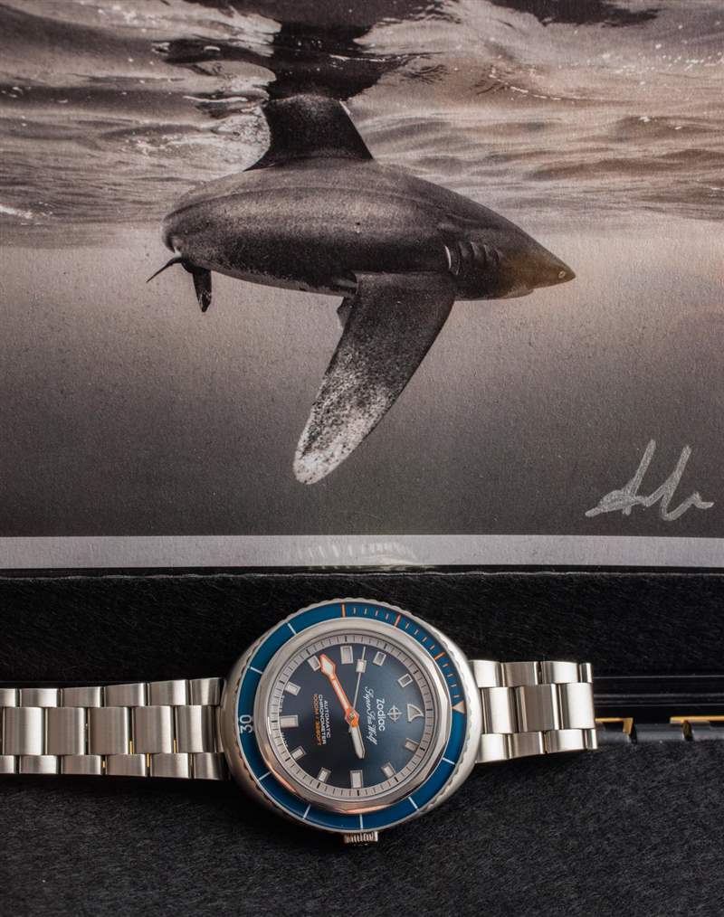 這個(gè)版本的 Zodiac Super Sea Wolf 68 Saturation 手表似乎始于一張現(xiàn)在流行的水下照片,安迪曼在巴哈馬附近拍攝了一條鯊魚(yú)。該照片的打印件包含在手表隨附的套件中,以及一些受歡迎的額外表帶。除了獨(dú)特的藍(lán)色漸變表盤(pán)外,這款腕表還設(shè)有一個(gè) 12 點(diǎn)鐘位置的時(shí)標(biāo),這是該表款的獨(dú)特之處,旨在看起來(lái)像鯊魚(yú)的背鰭。廣告訊息廣告信息結(jié)束
