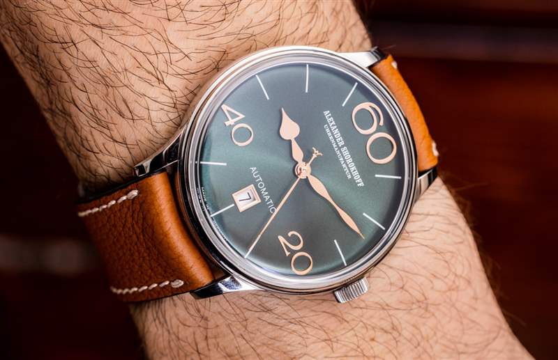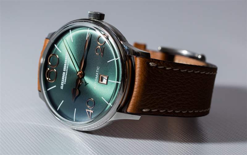 Alexander Shorokhoff 為 Model 63 提供四種表盤顏色,包括圖中的“翡翠綠”、“午夜藍、深黑”和“波爾多”。據(jù)我估計,這些顏色中的每一種在搭配盡可能接近表盤顏色的表帶時都會看起來最好,盡管添加黑色或棕色表帶顯然是最保守的選擇。再說一次,我不確定 Alexander Shorokhoff 作為一個品牌是否適合保守的鐘表佩戴者。