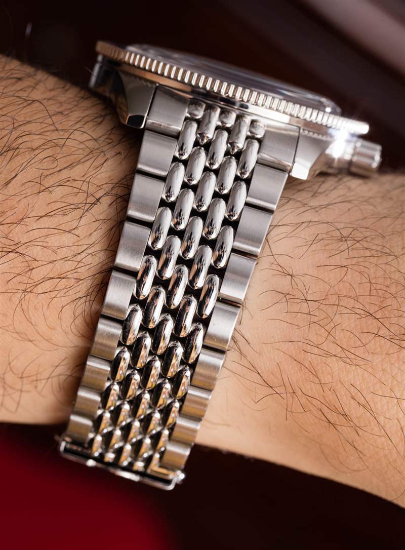 防水深度達(dá) 200 米,42 毫米寬的表殼感覺比其 12 毫米厚度可能暗示的要薄。部分原因可能是由于柔軟且傳統(tǒng)上薄的鋼表鏈。中間的“米?!辨湽?jié)經(jīng)過拋光處理,兩側(cè)是更寬的拉絲鋼鏈節(jié)。手鐲也從連接到表殼的地方逐漸變細(xì)。數(shù)量不多,但錐形有助于使整體設(shè)計(jì)感覺更加精致,并增加佩戴舒適度。