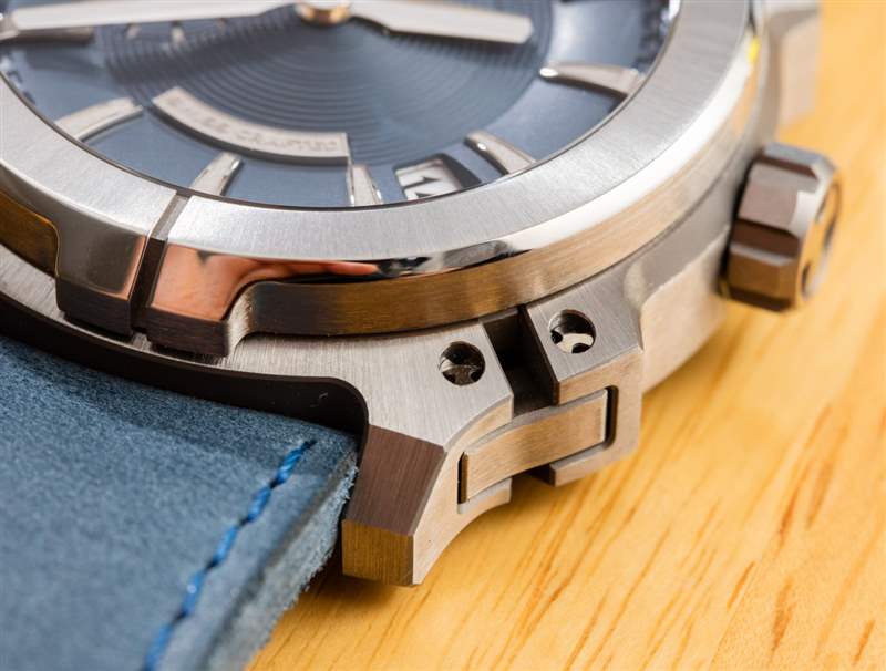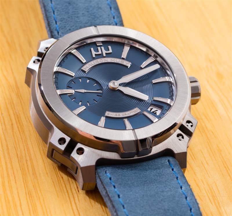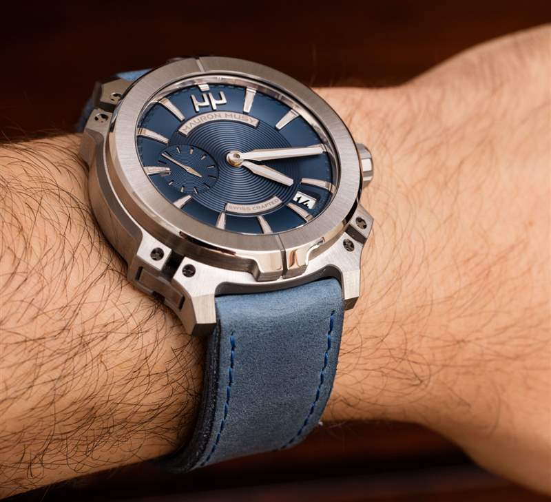 Armure MU03 表殼寬 44 毫米,非常突出,但我不會稱它為超大號。精心加工和拋光的鈦金屬表殼戴在手腕上看起來很棒,Mauron Musy 制作了一個特殊的表殼來模仿表盤上表殼的視覺效果。這家公司真的希望您注意它對金屬的加工能力——而 Armure 系列旨在體現(xiàn)其對精細金屬拋光的癡迷。全金屬表盤包括應(yīng)用時標(biāo)(每個都經(jīng)過復(fù)雜的鉆石拋光處理),以及指針和裝飾表盤(此處為藍色)。癡迷的人會喜歡表盤有一個全尺寸的 9 點鐘指示器,盡管在那個位置有一個輔助秒盤(指針掃過時標(biāo)中間的一個切口)。