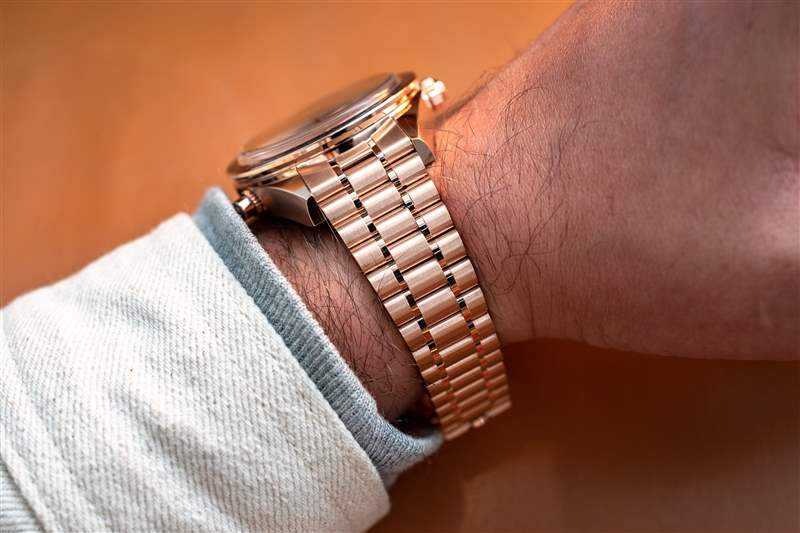 拿在手里和戴在手腕上,這兩款手表都又大又重,感覺很特別。在這兩者中,我絕對更喜歡 Speedmaster Chrono Chime,不僅因為它熟悉的漂亮外觀,還因為砂金石表盤和小表盤的扭索飾面的可愛組合(我認為這看起來很棒)。雖然肯定很寬而且很厚,但兩種型號的重量都給我的手腕留下了最顯著的印象。如果您不介意大表,我可以看到 Speedmaster Chrono Chime 很容易佩戴,只要您正確調整了錐形表鏈的尺寸并針對所有黃金的原始重量進行了完全重新校準。同樣,僅機芯就有超過 45 克黃金。