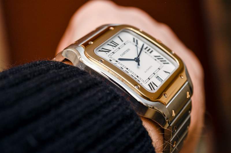 卡地亞完全重新設(shè)計(jì)了 Santos 表殼。更新后的 Santos 最引人注目的是它已經(jīng)瘦了多少。以前的男士版本稱為 Santos 100 或 Santos XL。它是相同的大約 38 毫米寬的尺寸,但由于表殼厚度增加,感覺(jué)更大。較厚的舊款有一種受歡迎的陽(yáng)剛之氣,但從工程的角度來(lái)看,新款顯然更令人印象深刻,而且更薄的尺寸意味著 Santos 再次成為男士的絕佳正裝手表選擇。