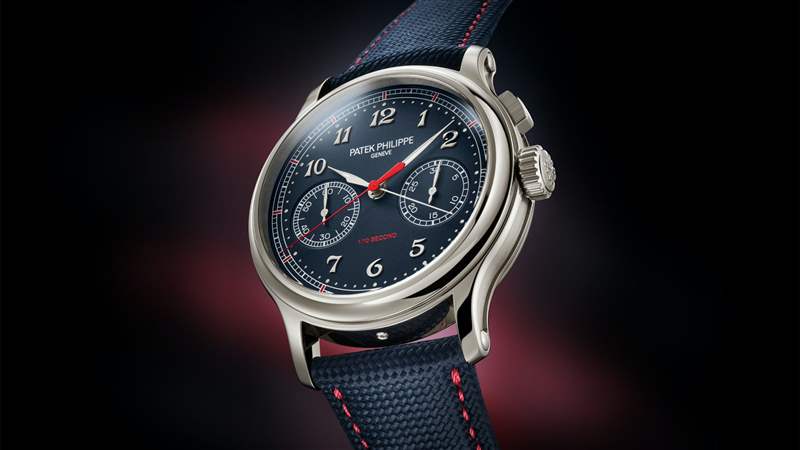 乍一看,這看起來(lái)像是一款絕對(duì)經(jīng)典的鉑金雙刻度計(jì)時(shí)碼表(六點(diǎn)鐘位置的表耳之間有一顆小鉆石,就像所有百達(dá)翡麗鉑金手表一樣)。乍一看是計(jì)時(shí)碼表秒針的紅色中央指針看起來(lái)有點(diǎn)不尋常,尤其是在深藍(lán)色表盤(pán)的映襯下,但除此之外,這很可能是 1952 年和 2022 年的百達(dá)翡麗計(jì)時(shí)碼表。然而,仔細(xì)觀察, 你注意到實(shí)際上有兩個(gè)計(jì)時(shí)碼表的中心指針,表盤(pán)上用小的、不同的字母顯示“1/10 秒”——然后外部經(jīng)過(guò)的秒數(shù)刻度實(shí)際上是兩個(gè)刻度,一個(gè)刻度表示經(jīng)過(guò)的秒數(shù)(和分鐘數(shù)) ,當(dāng)從分針上讀取時(shí))和一個(gè)外部的,有 12 個(gè)紅色索引,旨在讓您從紅色中央計(jì)時(shí)指針讀取 1/10 秒的增量。紅色計(jì)時(shí)指針每 12 秒繞表盤(pán)轉(zhuǎn)動(dòng)一圈。