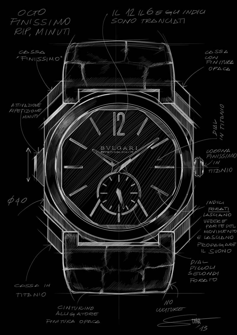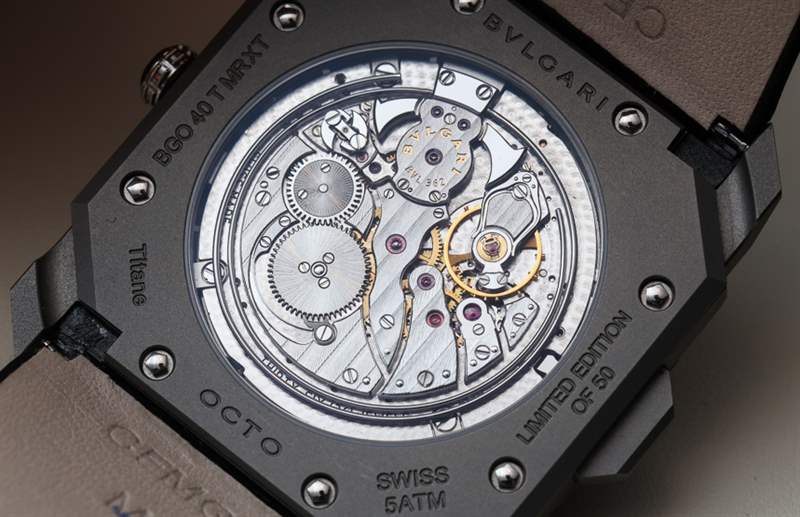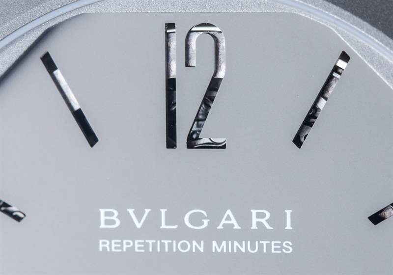 在噴砂鈦中,這種近乎工業(yè)的表面處理并不是大多數(shù)人對高端奢華手表的期望。話雖如此,鈦是用于三問報時表的最佳材料之一,因為它的特性不會減弱報時的聲音。黃金或鉑金等貴金屬是響亮的三問表的大敵,而當您想要最響亮、最清晰的聲音時,鋼和鈦是更好的選擇。寶格麗不僅將鈦用于表殼材料,還用于表盤。如果仔細觀察,您會注意到寶格麗 Octo Finissimo 三問報時腕表最有趣的設計細節(jié)之一:鏤空時標和小秒盤。這不僅僅是為了風格,而是作為幫助聲音傳播的一部分,從而充分利用內(nèi)部空間讓鈴聲產(chǎn)生共鳴。