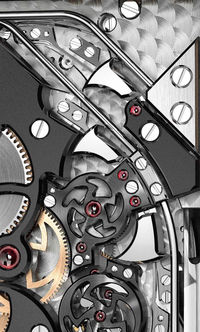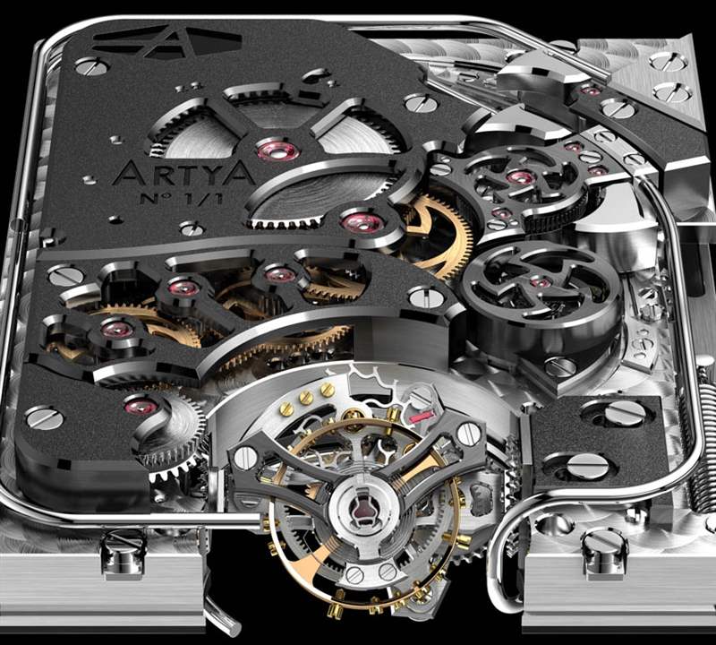 旋轉(zhuǎn)陀飛輪本身兼作小秒針指示器,而 ArtyA 三問報時器、調(diào)節(jié)器和雙軸陀飛輪腕表的表面也有獨(dú)立的時針和分針表盤——將傳統(tǒng)表盤與機(jī)芯的鏤空顯示融為一體。它的外觀“非常ArtyA ”——有點(diǎn)像傳統(tǒng)鐘表學(xué)和搖滾樂的結(jié)合。