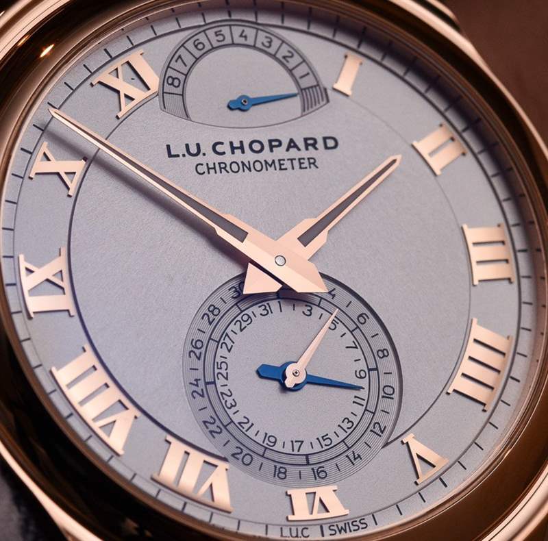 蕭邦 LUC Quattro 表盤上的時間指針為金色,與表殼材料顏色相匹配。動力儲存指示器和日期的指針是藍色的——這是一種很好的增色方式,可以幫助人們避免與指針混淆。表盤有輕微的深度,包括各種級別以及應用的指示器。平面表盤是任何高端外觀的敵人,更多的手表制造商知道這一點。我覺得蕭邦對 LUC Quattro 表盤的處理非常成功,盡管設計試圖稍微前衛(wèi)(從藝術角度來看,這在一天結(jié)束時往往是一件好事)。