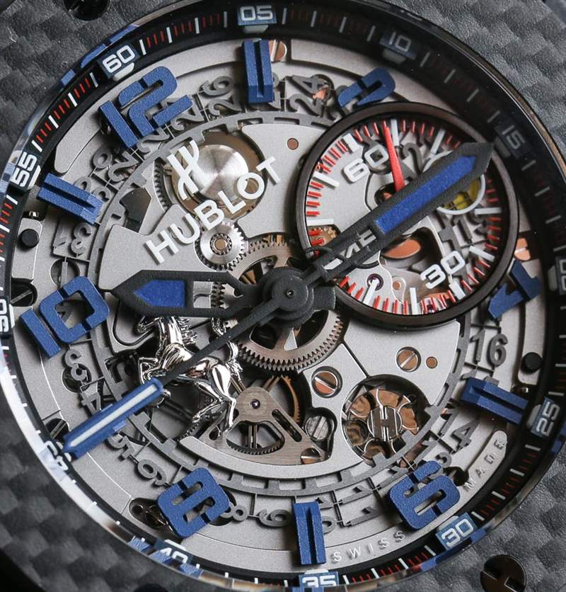 45.5 毫米寬的表殼采用黑色碳纖維制成,我認為是黑色鈦金屬底蓋。鏤空表盤、藍色指針和時標周圍的表圈也是碳纖維材質(zhì)。這款 Hublot Big Bang Ferrari USA 60th Anniversary 的底蓋有點獨特,底蓋周圍有紅色文字,而 Ferrari USA 60th Anniversary 標志印在機芯上方的藍寶石水晶底蓋上。