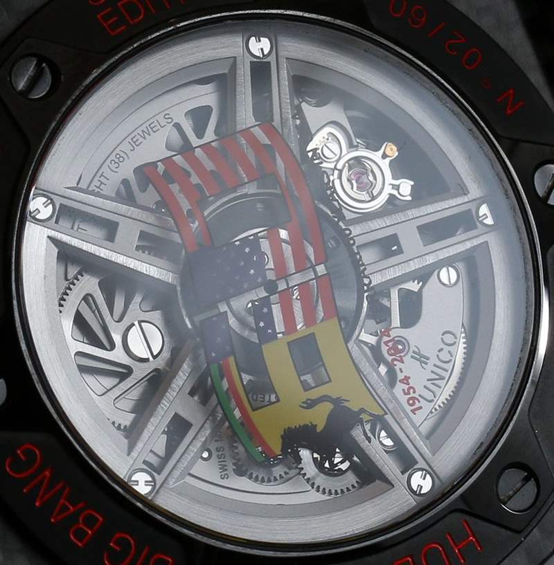 宇舶Big Bang Ferrari USA 60周年紀念腕表內(nèi)部搭載的是宇舶自產(chǎn)UNICO calibre 1241自動計時機芯,從美學(xué)角度來說我個人非常喜歡這款機芯。它將傳統(tǒng)機械機芯的外觀與現(xiàn)代風(fēng)格完美融合,包括橋板設(shè)計、鏤空和修飾。即使作為現(xiàn)代設(shè)計,表面處理也不會顯得過于工業(yè)化或斯巴達式。當(dāng)然,法拉利躍馬標志在手表的表盤上?!胺ɡ泵Q僅印在手表的側(cè)面(計時按鈕)和底蓋上。