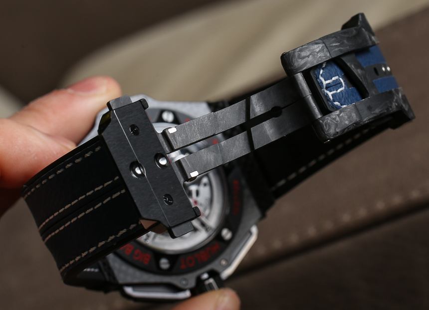 我喜歡的一種設(shè)計風(fēng)格是表帶展開裝置的碳纖維結(jié)構(gòu)。這不是 Hublot 第一次這樣做,但我真的很喜歡碳纖維表殼材料與展開器相匹配。這是一個小小的接觸,但它有助于完成碳纖維主題。許多品牌在表帶設(shè)計上都很吝嗇,在我看來,這是一種可怕的恥辱。Hublot 做對了,不僅是快速釋放表帶(每個表耳結(jié)構(gòu)上都有小釋放按鈕),而且表帶的整體外觀和感覺也是如此。
