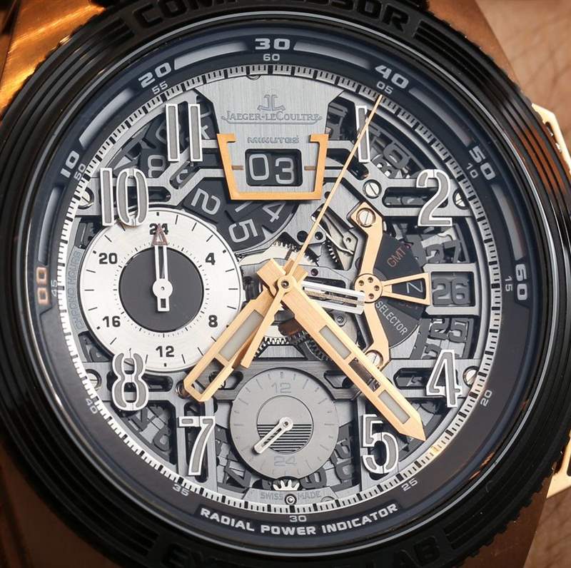 位于時(shí)針和分針旁邊的是一根附加指針,用作第二時(shí)區(qū)。它不是真正的 GMT 指針,因?yàn)樗?12 小時(shí)格式指示時(shí)間,但它在 6 點(diǎn)正上方確實(shí)有一個(gè)專用的 24 小時(shí)表盤,用于指示第二時(shí)區(qū)是上午時(shí)間還是下午時(shí)間. 靠近 3 點(diǎn)鐘的位置是一個(gè)日期窗口,緊靠日期窗口的左側(cè)是表冠操作的功能選擇器(當(dāng)您按下表冠時(shí),它會(huì)循環(huán))。最后,Jaeger-LeCoultre Extreme Lab 2 具有動(dòng)力儲(chǔ)存指示器。在其他一些手表中復(fù)制時(shí),Jaeger-LeCoultre 使用 Master Compressor Extreme Lab 2 首次推出其“徑向功率指示器”,當(dāng)動(dòng)力儲(chǔ)存從“00”到整整60小時(shí)。