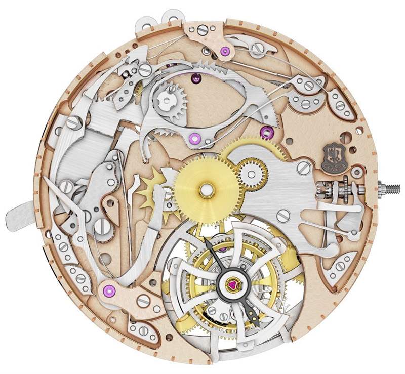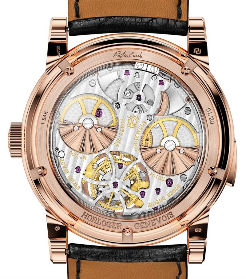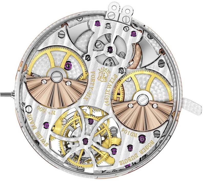 許多手工裝飾是新自制機(jī)芯 RD104 獲得日內(nèi)瓦印記 (Poincon de Geneve) 資格的一部分。幾年前,日內(nèi)瓦印記背后的人大大提高了對(duì)帶有印記的機(jī)芯的要求。機(jī)芯除了需要在日內(nèi)瓦州生產(chǎn)并具有一定的性能指標(biāo)外,還需要大量的手工修飾。這意味著大部分單獨(dú)的機(jī)芯部件必須手工拋光。RD104 機(jī)芯包含 434 個(gè)零件,這有助于解釋為什么要花費(fèi)如此多的時(shí)間獨(dú)自進(jìn)行精加工。該機(jī)芯還以 3Hz 運(yùn)行,并具有 60 小時(shí)的動(dòng)力儲(chǔ)存。微型轉(zhuǎn)子是玫瑰金色調(diào),但實(shí)際上是由鉑金制成的。