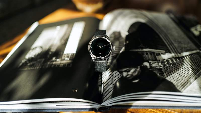 Cho 提到的那些表盤標記可能看起來很簡單,但實際上創(chuàng)建起來非常復雜。結果是此版本中最有趣的部分:測試 Vantablack 的極限。過去,Moser 推出了完全沒有標記的 Vantablack 模型,這是有充分理由的。這是一個可以通過觸摸損壞的表面。根據 Moser 的說法,在同一份新聞稿中,由碳納米結構制成的 Vantablack 無法與其他任何東西接觸。因此,該品牌需要開發(fā)——而且顯然已經開發(fā)了——一種特殊的技術來展示這些微小的標記。雖然它們看起來已被應用,但實際上并未應用。相反,它們是表盤本身的小孔,露出下面的盤子。