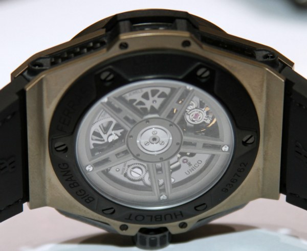 Big Bang Ferrari 內部裝有自制的 Hublot Unico 1241 自動計時碼表機芯。這是首批配備較新自制機芯的手表之一。Unico 是 Biver 的另一項引以為豪的成就——開發(fā)和生產(chǎn)適合其低容量超高端手表的自制機芯。1241 型機芯在表盤上完全鏤空,提供時間(無秒)、日期和 60 分鐘計時碼表。機芯的轉子設計得像法拉利汽車的車輪。表盤和表背的鏤空工藝極具技術感和吸引力。Hublot 甚至為更新后的 Big Bang 手表設計了新的指針和時標。另一個巧妙的功能是表冠,無需擰入,而是擰入并牢固鎖定。