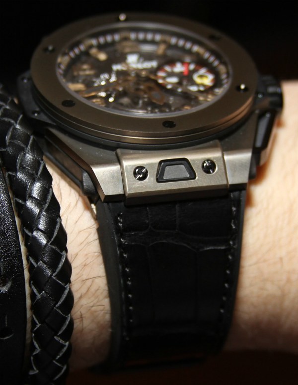 表帶更換系統(tǒng)非常好用。凸耳上有一個推桿,您可以按下它來松開表帶。它點擊退出,然后再次點擊返回。該系統(tǒng)允許佩戴者更換 Hublot 表帶,這對 Hublot 來說可能是一項新的有利可圖的業(yè)務——因為它的手表所有者可以根據(jù)自己的喜好親自更換表帶。