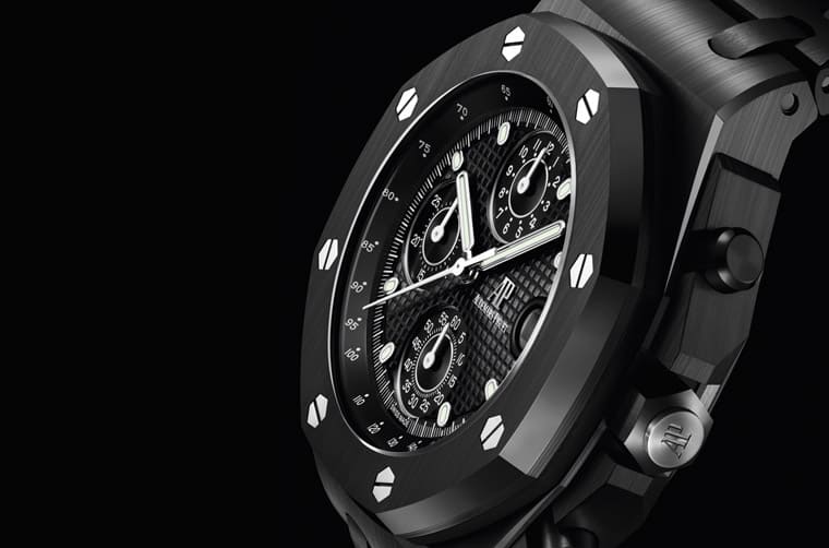 ▲復(fù)刻味強烈的皇家橡樹離岸型自動上鏈計時碼表2023年首度以黑色陶瓷制作表殼與鏈帶。