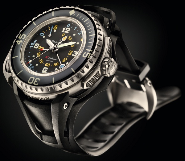 寶珀剛剛發(fā)布了宣傳了一段時間的新款X Fathoms潛水表。新的超級潛水員在迪拜推出,包含一個機械深度計以及一些有趣的功能。其中之一是表盤上始終運行的逆行五分鐘計數(shù)器。這意味著用于測量減壓時間。世界上沒有其他潛水表具有這樣的外觀。