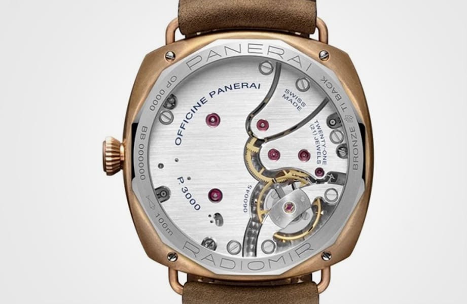▲底蓋邊緣改成鈦金屬材質(zhì)以避免青銅材質(zhì)與皮膚接觸后可能導(dǎo)致過敏現(xiàn)象,透明底蓋露出P.3000機芯面目讓人一窺品牌工藝水準。