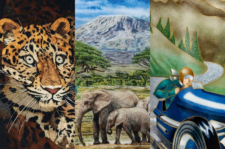 畫面呈現(xiàn)非洲吉力馬札羅山的景色,圖案前景還加入象群經(jīng)過的壯觀畫面。品牌工藝師使用一把微型畫筆,組合18種底色,巧妙地以手工描畫出栩栩如生的畫像,至于面盤部分則是先飾以手工扭索飾紋,再用半透明藍色琺瑯點綴,兩種工藝結(jié)合賦予面盤更多層次的美感。