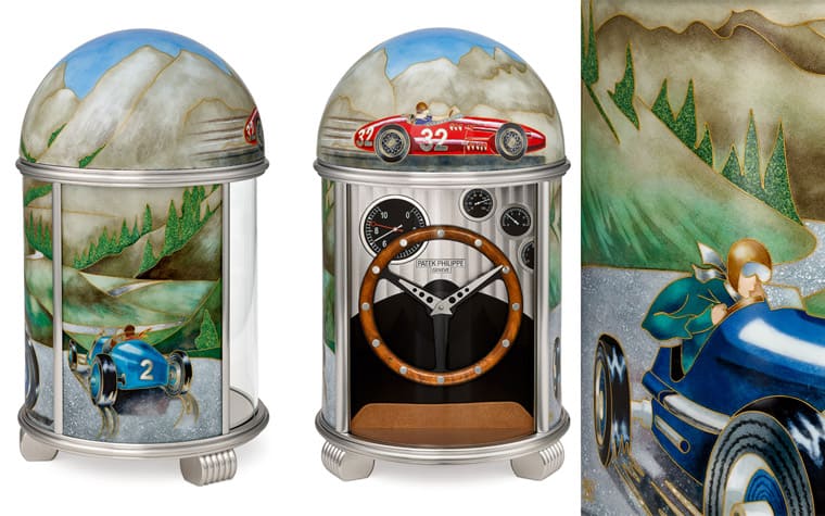 由于座鐘的體積比手表大很多,因此它的掐絲琺瑯金線相對較粗(直徑0.2×0.6mm),總長更是達到8.17m!工藝師先用金線打造出20世紀中期賽車運動的實況,再用71種琺瑯色彩分別突顯出賽車、賽車手、山路、山脈等畫面,百達翡麗專程選用花梨瘤木制成鐘盤,為了強調(diào)賽車主題,品牌還刻意將鐘盤設計成賽車方向盤的造型,同時鐘盤上還鑲有幾枚小巧的儀表,讓人仿佛正坐進賽車座艙中直視前方般充滿濃濃賽車的緊張氛圍。