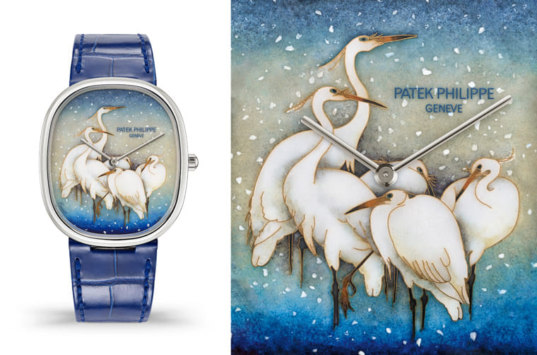 PP參考1920年代一幅著名日本版畫,透過掐絲琺瑯工藝重現(xiàn)雪中白鷺的場景,面盤上的白鷺以總長約50cm長的纖細金線(直徑僅0.05×0.4mm)手工勾勒出外型輪廓,再用多達20種半透明、不透明、半透明和乳白色的琺瑯填入金線中的空間,捕捉圖案的生命力,每枚面盤會在約800°C的高溫下燒制15次才大功告成。
