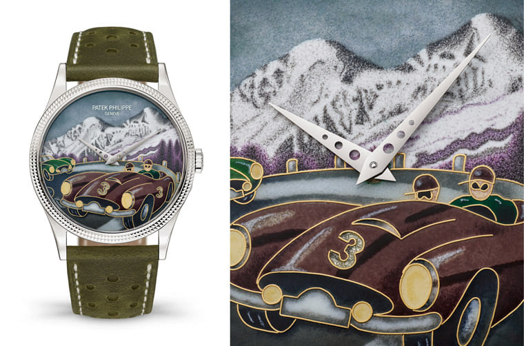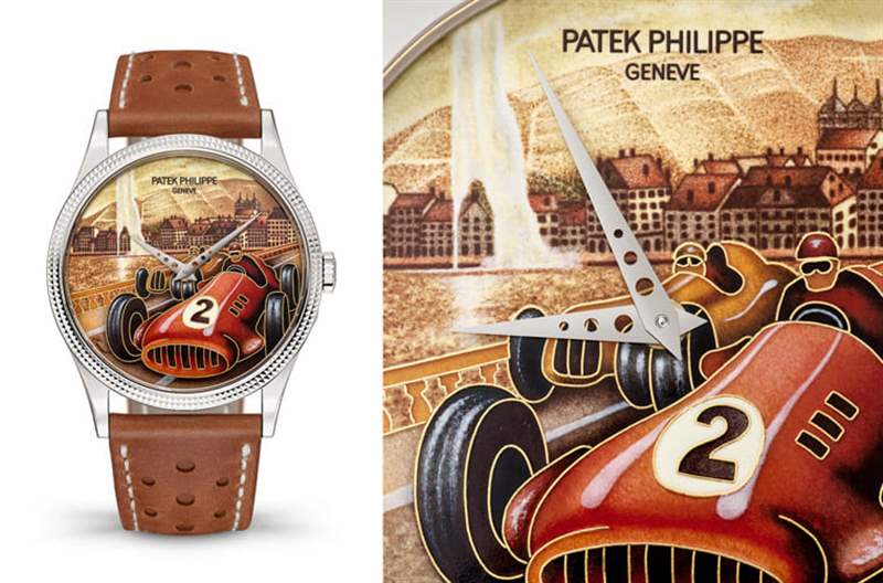這只表的面盤同樣在描繪早期的賽車項目——阿爾卑斯山拉力賽,百達翡麗工藝師持續(xù)以掐絲琺瑯工藝表現(xiàn)當年熱血沸騰的賽車場景,最終品牌用了16種琺瑯顏色完成畫面圖案,特別的是品牌用半透明琺瑯下方的銀葉(亮片琺瑯)照亮領(lǐng)先賽車上的車身號碼,而阿爾卑斯山景色則完全采用微繪琺瑯細細描繪而成。