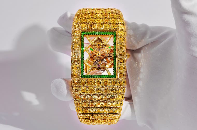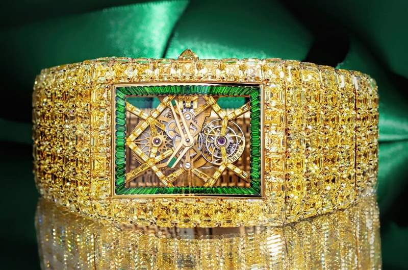▲JACOB & CO.最新高級珠寶表Billionaire Timeless Treasure采用大量黃鉆鑲嵌,要價高達(dá)2000萬美金。