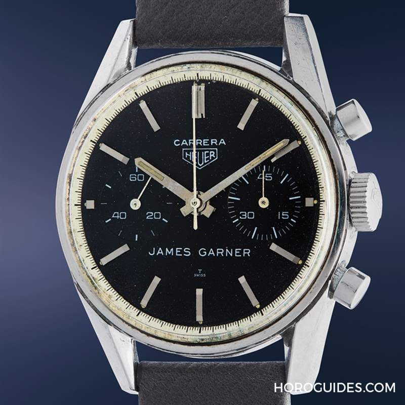 編號24拍品是美國影星James Garner的時計珍--一只約1966年制的Tag Heuer Carrera腕表型號2447,這只表徑35mm、精鋼材質(zhì)的計時碼表,被命名為「Carrera James Garner」,表盤上除了有標示有品牌識別Heuer Carrera,六點鐘位置亦注記有「James Garner」字樣。曾入圍奧斯卡金像獎的的James Garner不只演過賽車手,現(xiàn)實生活中他本人也真的熱愛賽車,他的女兒Gigi Garner回憶說,他經(jīng)常戴著這只表去駕駛賽車,這是「他最喜愛的日常配戴表」。此拍品由Tag Heuer博物館以17.6萬美元拍得。
