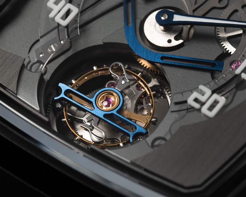 開放式表盤巧妙通過不同的灰色調(diào)凸顯立體層次感,表盤左側(cè)是「線性」時標(biāo)刻度條,通過一枚彎曲的藍(lán)鋼時針指示當(dāng)前小時讀數(shù),這一機(jī)制還具有逆跳功能,在12點(diǎn)最后一秒跳至1點(diǎn)位置。表盤右側(cè)是藍(lán)寶石水晶分針盤,6點(diǎn)位是飛行陀飛輪。所有指針和數(shù)字刻度均涂覆熒光材料。