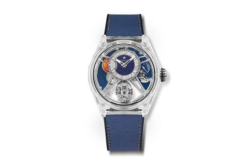 值得一提,表廠重新設(shè)計整枚機芯,采用全新布局結(jié)構(gòu),呈現(xiàn)更開闊而明朗的顯示,機芯被完全包覆于透明藍寶石水晶玻璃表殼之內(nèi),無論如何變換視角,機芯的輪廓皆清晰可見,實屬表廠首創(chuàng)。而表盤在明藍寶石水晶玻璃表殼之中,亦有如擺脫地心吸力,懸浮于半空。