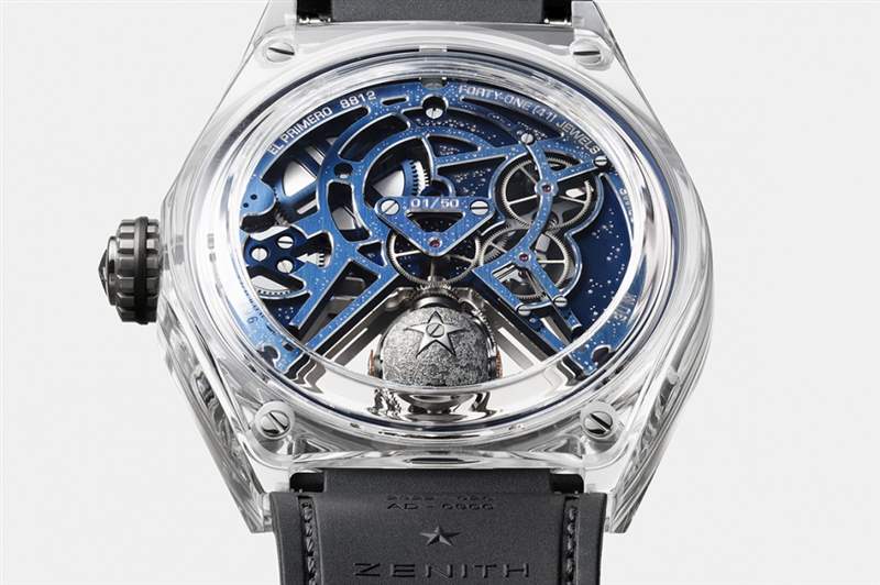 這兩枚新作以繾綣星光為靈感,整枚表散發(fā)著科幻摩登的感覺,表盤中又加入了星星的元素,是一款Zenith少見的設(shè)計。先說一下DEFY Zero G藍寶石腕表吧,根據(jù)官方的說法,這表的出現(xiàn)是因為制表師們一直渴望克服地心吸力對計時精準(zhǔn)度帶來的影響,所以Zenith運用重力控制裝置完美解決這一問題,將調(diào)校機構(gòu)固定于萬向裝置上,無論腕表如何旋轉(zhuǎn),始終能保持水平位置。所以如果你想看看腕表陀螺儀模組背面呈現(xiàn)如月球表面般凹凸不平的質(zhì)感,將腕表高舉頭頂方能看到。