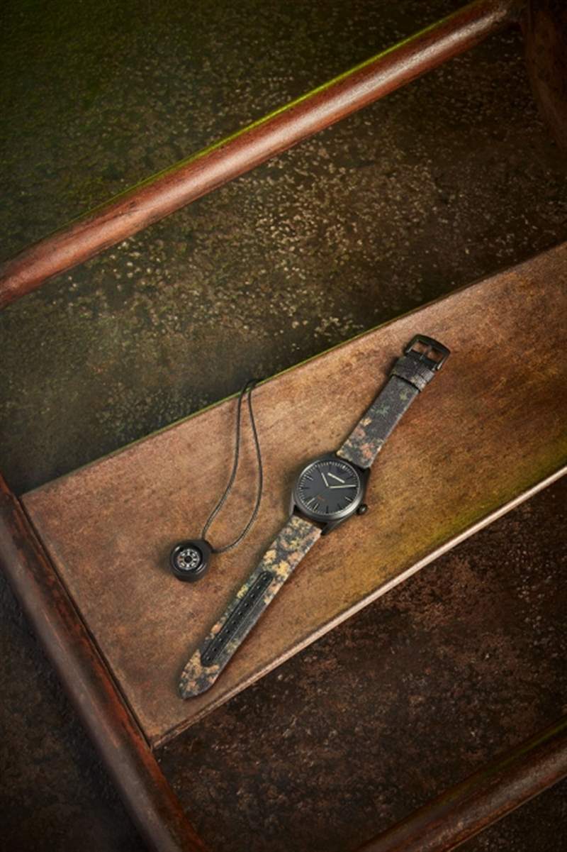 Emporio Armani 推出可持續(xù)膠囊系列,其中一款太陽能RPET 腕表連項鏈套裝將可再生能源技術(shù)放置于41亳米腕表之中,啞黑色表殼配搭迷彩色RPET表帶,將腕表在環(huán)保元素上推上另一個層次,遵循再生物料的理念,減輕對環(huán)境帶來的影響。配套的指南針項鏈,令造型更具戶外大自然的感覺。