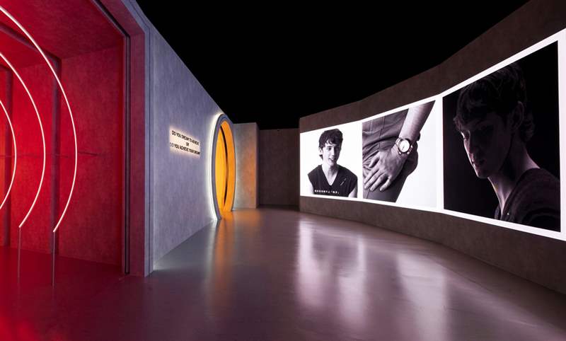 一走入展場,馬上就能領(lǐng)略到這個展覽的不一樣,兩個不同的入口-「方中帶圓:成就夢想」以及「圓中帶方:夢想成功」隧道,讓參觀者自行選擇,人生就像是一場不斷做選擇的歷程,每一個決定都左右著你即將通往的方向。邁入彩色燈管所串連起的光束隧道后,呈現(xiàn)在眼前的是一個以Pasha da Cartier的設(shè)計元素所構(gòu)筑的世界,方中帶圓貫穿全場,頻頻出現(xiàn)的鏡面讓人聯(lián)想到Pasha da Cartier渾圓表殼的講究拋光,閃亮如鏡。
