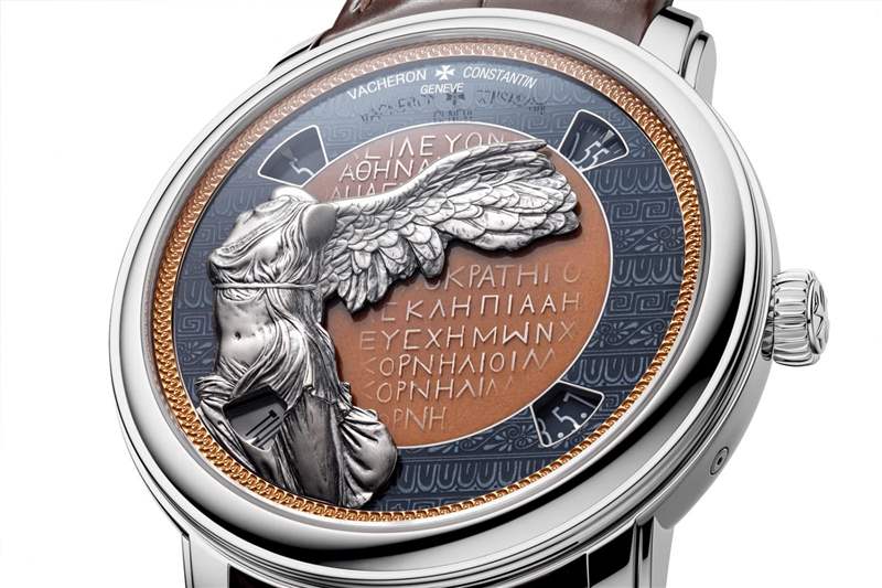 第三枚時(shí)計(jì),江詩(shī)丹頓憑借來(lái)自薩莫色雷斯的勝利女神雕像,轉(zhuǎn)向了希臘歷史的希臘化時(shí)期。Victory,也被稱(chēng)為耐克,是廣闊的希臘萬(wàn)神殿中的一員,與標(biāo)志性的奧林匹亞眾神并列。人們相信,Victoire de Samothrace 是為了紀(jì)念希臘在海上取得的一次重要?jiǎng)倮?,因?yàn)榕癖幻枥L成站在船頭上,而雕像是在北愛(ài)琴海薩莫色雷斯島上的一座寺廟建筑群中發(fā)現(xiàn)的。許多重要的海戰(zhàn)。